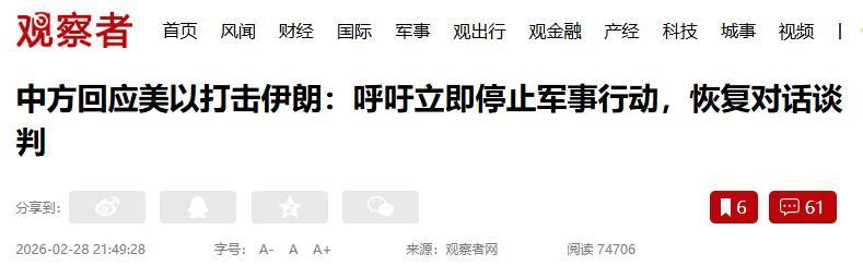外交部明确表示尊重伊朗的国家主权、安全和领土完整,呼吁立即停止军事行动、恢复对话谈判。