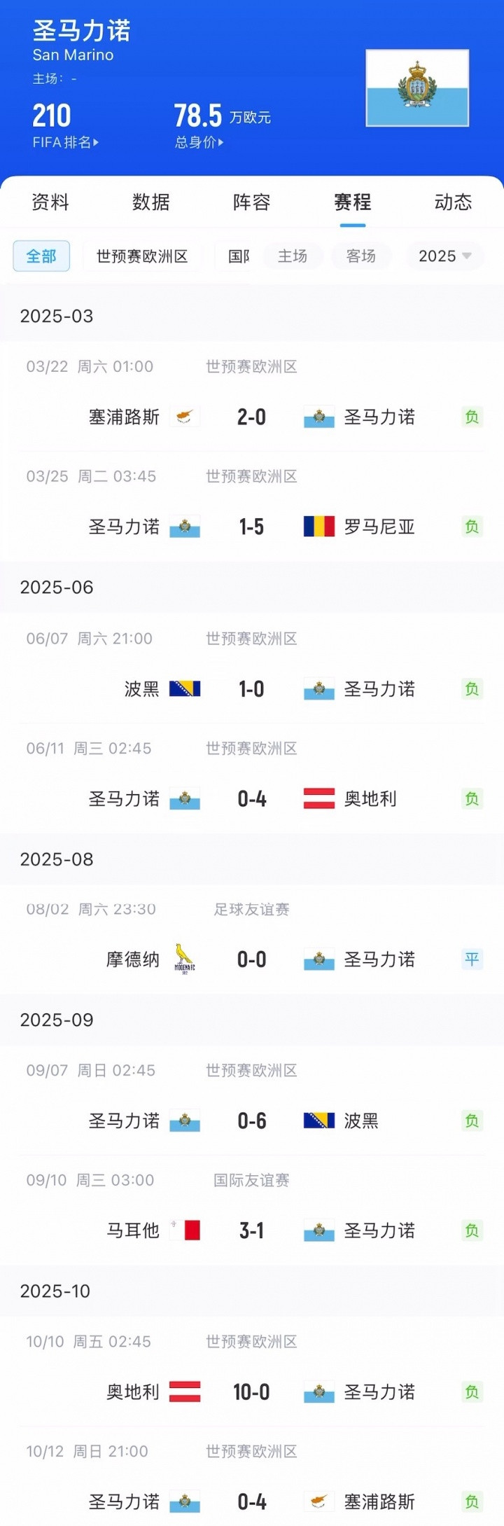2025年至今,圣马力诺出战了9场国际比赛,取得了1平8负的战绩,进失球比为惨淡的2-35。
